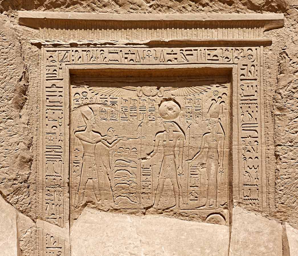 Ramsès II fait un encensement et verse une libation, actions de purification, devant Rê-Horakhty et Nekhbet. Le dieu lui donne en retour de nombreuses fêtes Sed, toute la santé et toute la joie. Nekhbet lui donne la durée de vie de Rê. Au dessus, le disque ailé Behedety veille.