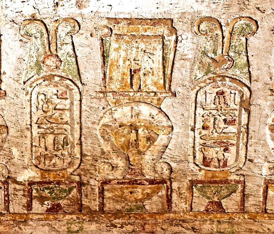 Au dessus des restes d'un texte, la frise montre alternativement un tête d'Hathor surmontée d'un sistre et les cartouches de Ptolémée VIII. Les représentations sont posées sur le signe de l'or. Cette frise court plus ou moins complète tout le long des parois de chaque côté.