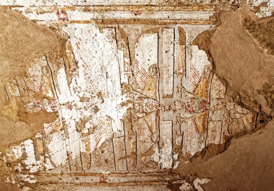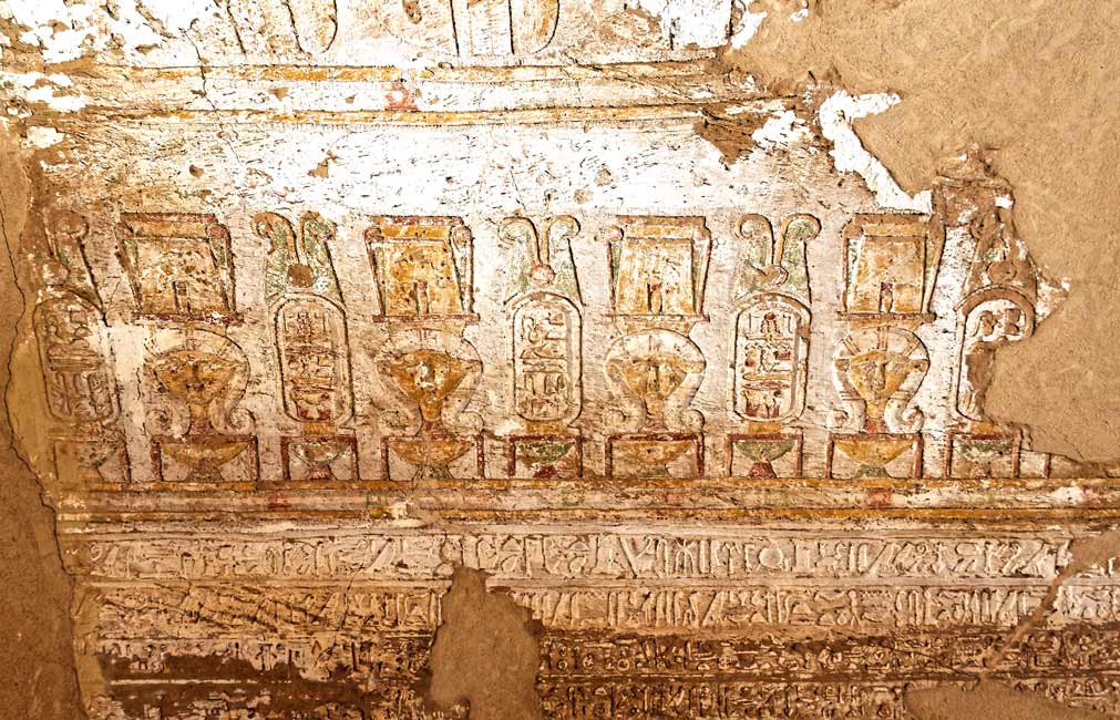 Des vautours aux ailes déployées décorent le plafond. Ils représentent alternativement Nekhbet à tête de vautour et Ouadjet à tête de serpent, sans aucun cartouche de roi.