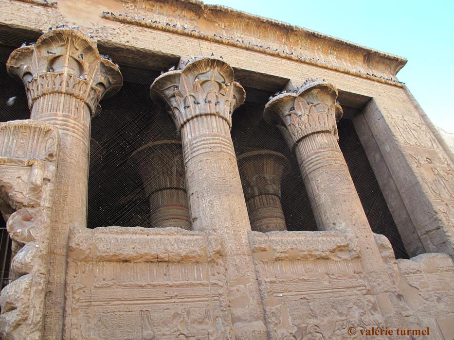 Les 6 colonnes supporta,t la travée de la façade furent décorées sous le règne de Domitien (81-96). Sous les chapiteaux, en dessous d'un bandeau de texte, se déroulent des frises de Nekhbet et Khnoum entourant les cartouches de l'empereur (voir un exemple pour les colonnes intérieures). Un grand texte occupe l'espace restant.