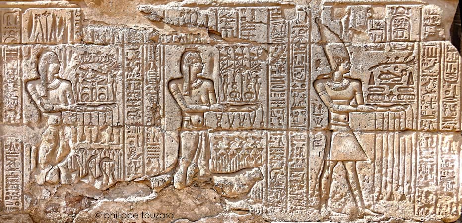 Vespasien est accompagné de dieux Hapy. L'empereur et les dieux Hapy portent chacun des offrandes différentes.