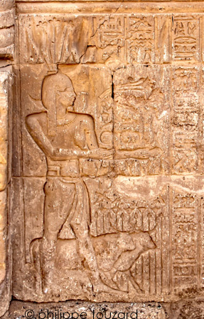 L'empereur Claude reçoit la vie de Khnoum qui lui promet des millions de fêtes Sed. Derrière le dieu, lHeka, personnification de l'énergie vitale et des pouvoirs magiques. Heka lui donne l'éternité dans la vie, la stabilité, le pouvoir, la royauté. (Sauneron n°51)