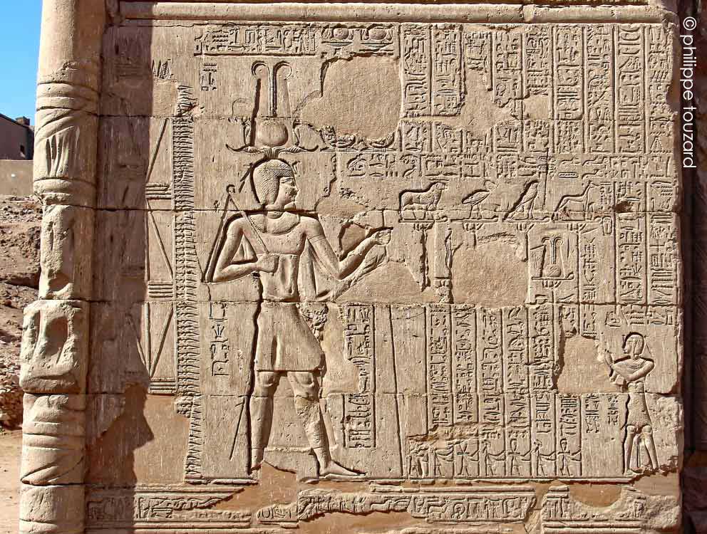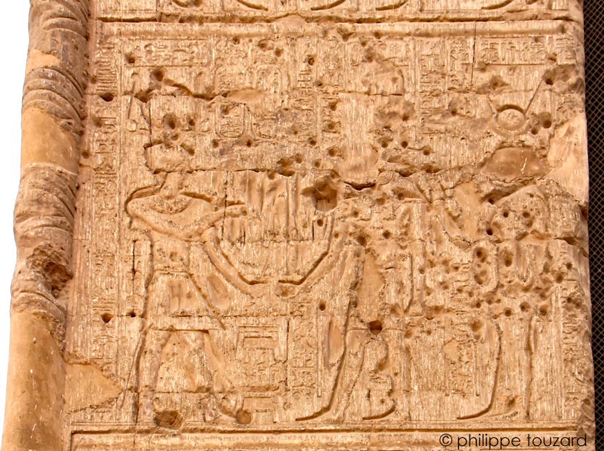 La titulature est dégradée. Il s'agit soit de Claude soit de Vespasien (69-79). L'empereur sort du palais pour se rendre dans le temple. Il est précédé de 7 enseigns : Oupouaout du sud, le cartouche royal, le faucon d'Horus, l'ibis de Thot, l'arc de Neith et le bélier d'Amon.(Sauneron n°52)