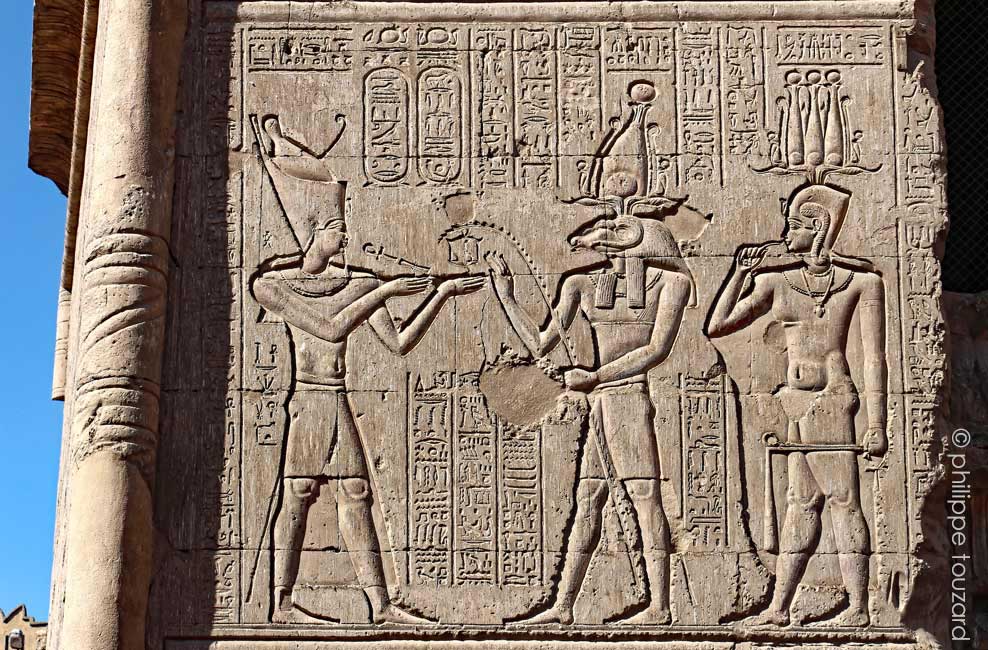L'empereur Claude sanctifie des offrandes pour Khnoum de la campagne et Nebetouou, parèdre de Khnoum apparaissant surtout dans ce temple d'Esna. La déesse lui donne tous les pays étrangers sous ses sandales (Sauneron n°50)
