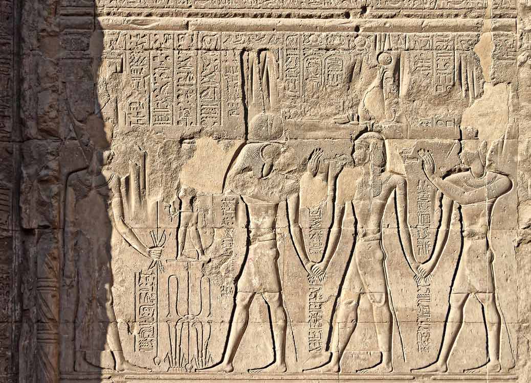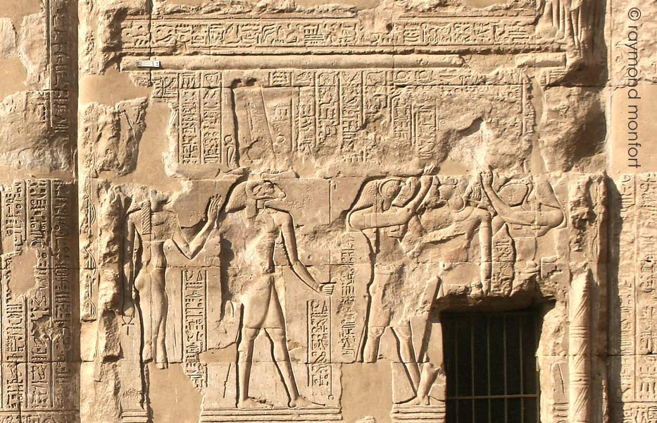 A gauche, scène de couronnement du roi soitit l'empereur Néron (Sauneron n°88). Au dessus, le frise contient les cartouches de Vespasien qui régna après Néron (Sauneron n°86).