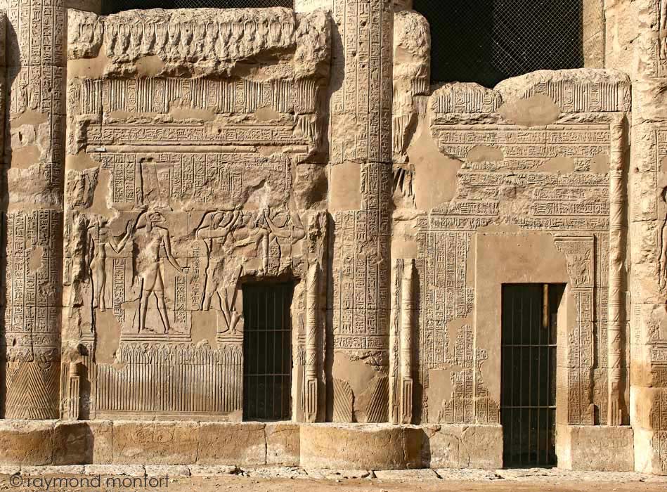 A droite, le mur-bahut comprend la porte, en symétrie de celui du côté Sud. Les textes sont de Domitien. Il reste un bout de scène sur le linteau de la porte : Domitien offre deux vases de lait à Neith.(Sauneron n°79 à 85).