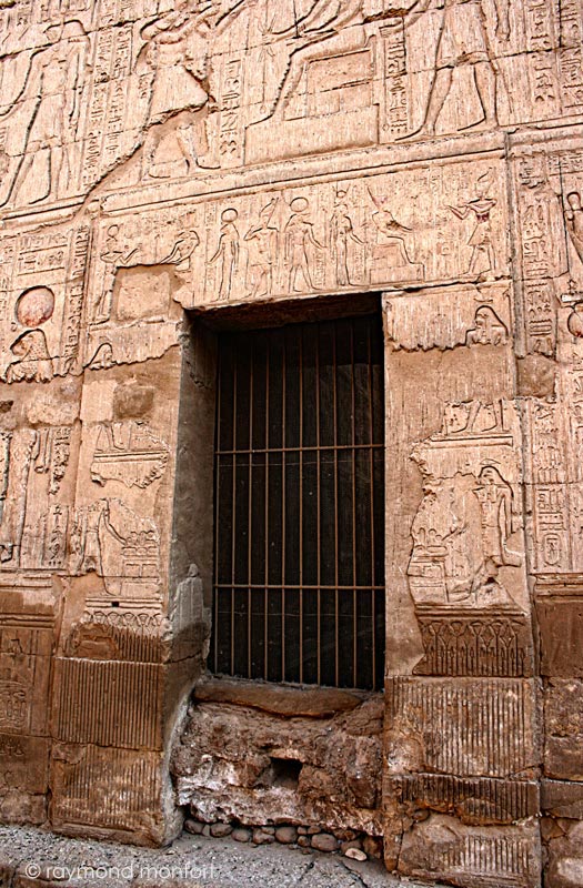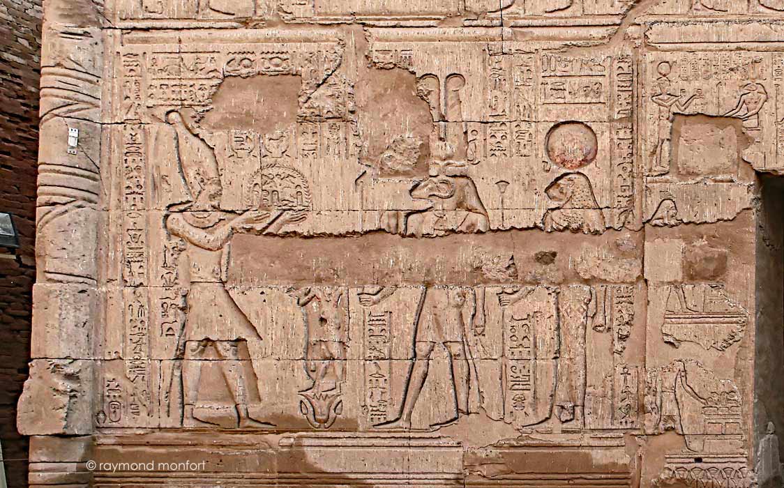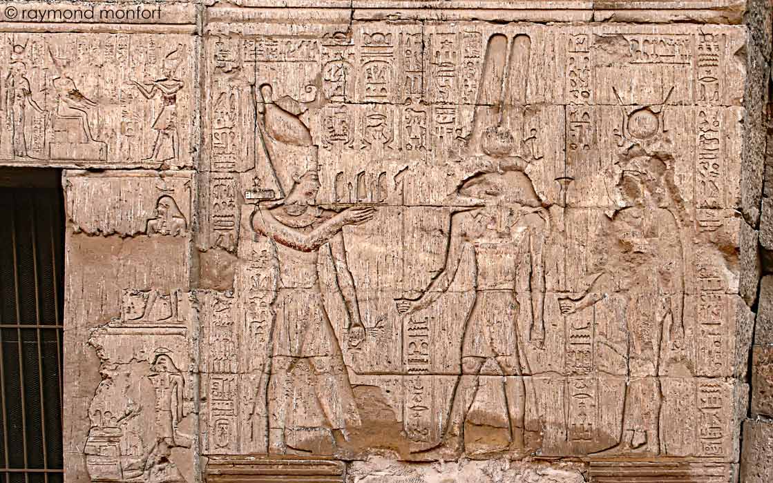 -à gauche, offrande de 2 vases à Khnoum d'Esna, Menhyt et Heka, personnification de l'énergie vitale et des pouvoirs magiques.