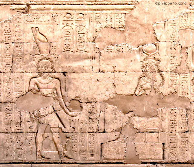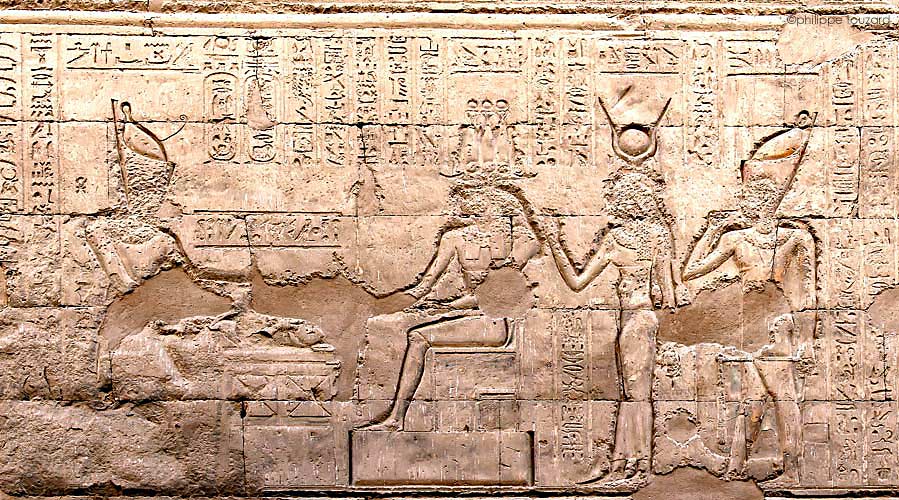 Il est accompagné d'Isis et d'un dieu enfant. (Esna VII n°622).