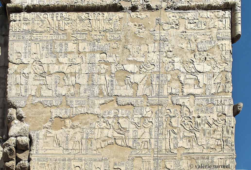 Commode massacre le taureau, incarnation de Seth pour que l'intégrité d'Osiris soit préservée, devant Khnoum de la campagne et Nebetouou.(Sauneron n°559)