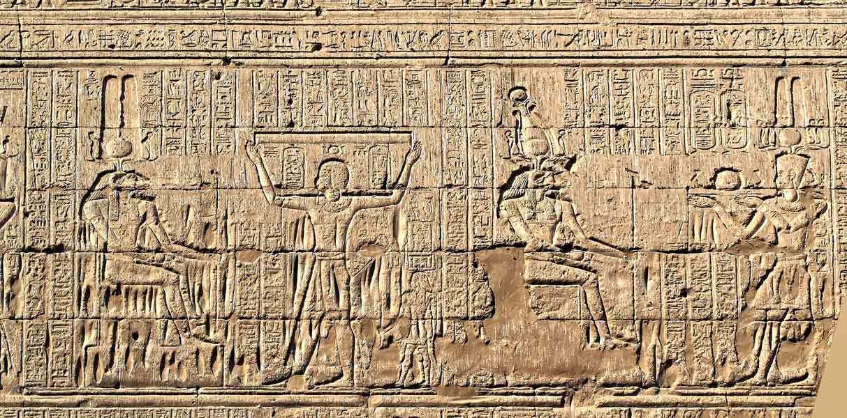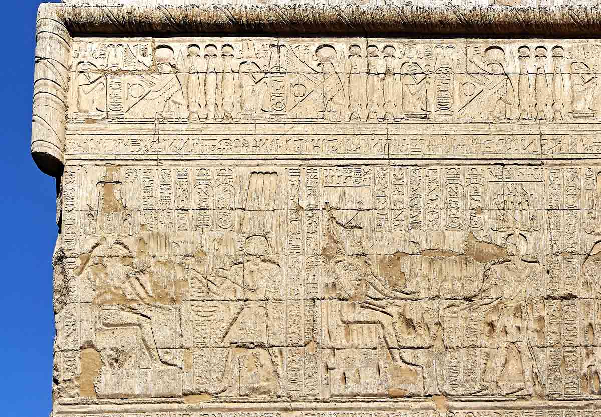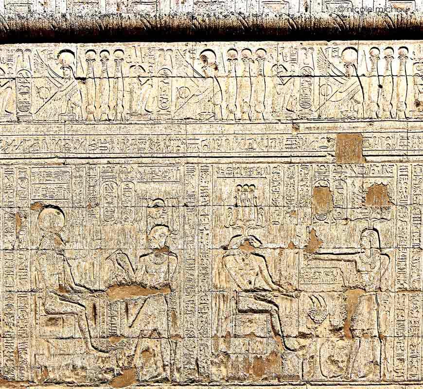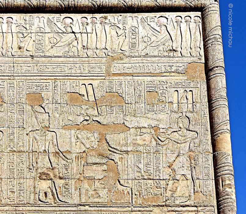Dans la frise ,en dessous, les cartouches de Vespasien sont entourés de Behedety et du dieu Khnoum.