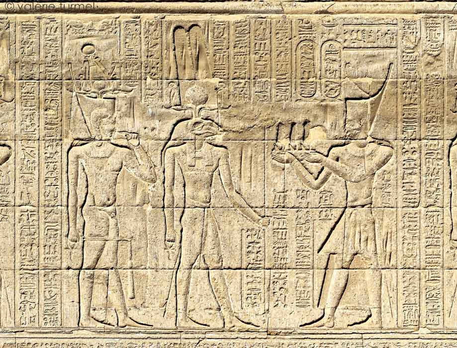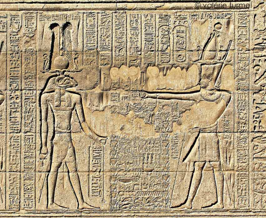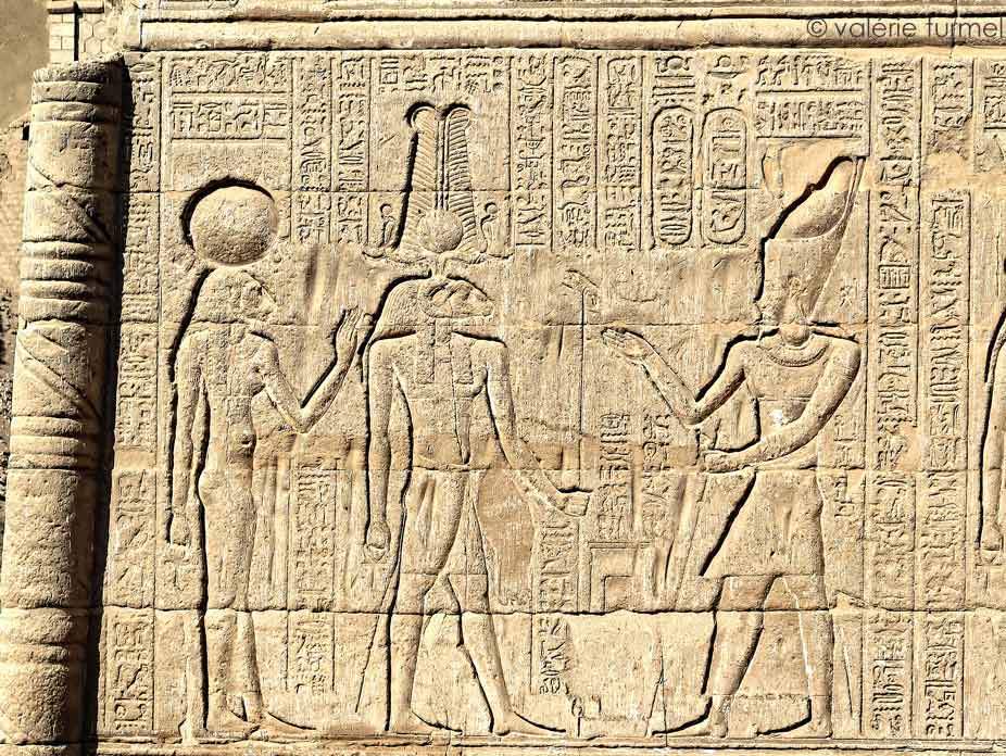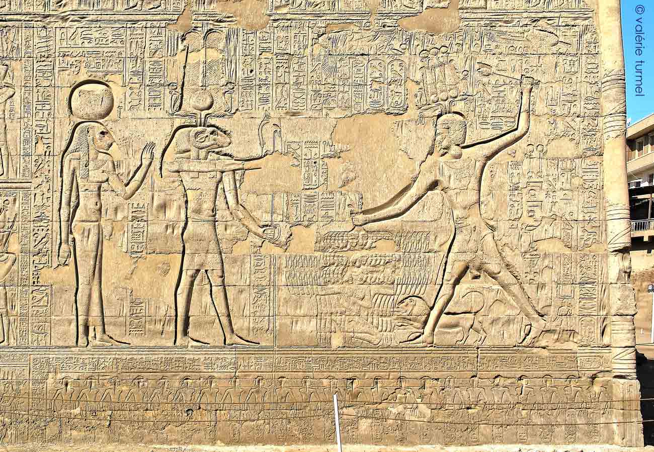 Khoum lui tend le sceptre de guerre dont l'extrémité est ornée d'un petit bélier. Il tient une longue corde à laquelle sont rattachés deux séries de captifs individualisés représentés sous le bandeau en bas de la scène. Derrière Khnoum, une de ses parèdres, Menhyt.