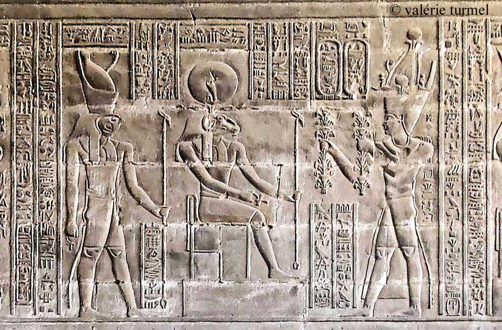 L'empereur Caracalla offre des fleurs à Rê-Horakhty à tête de bélier et à Horus de Nekhen.