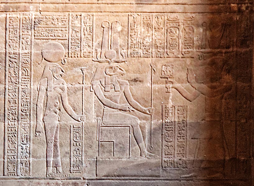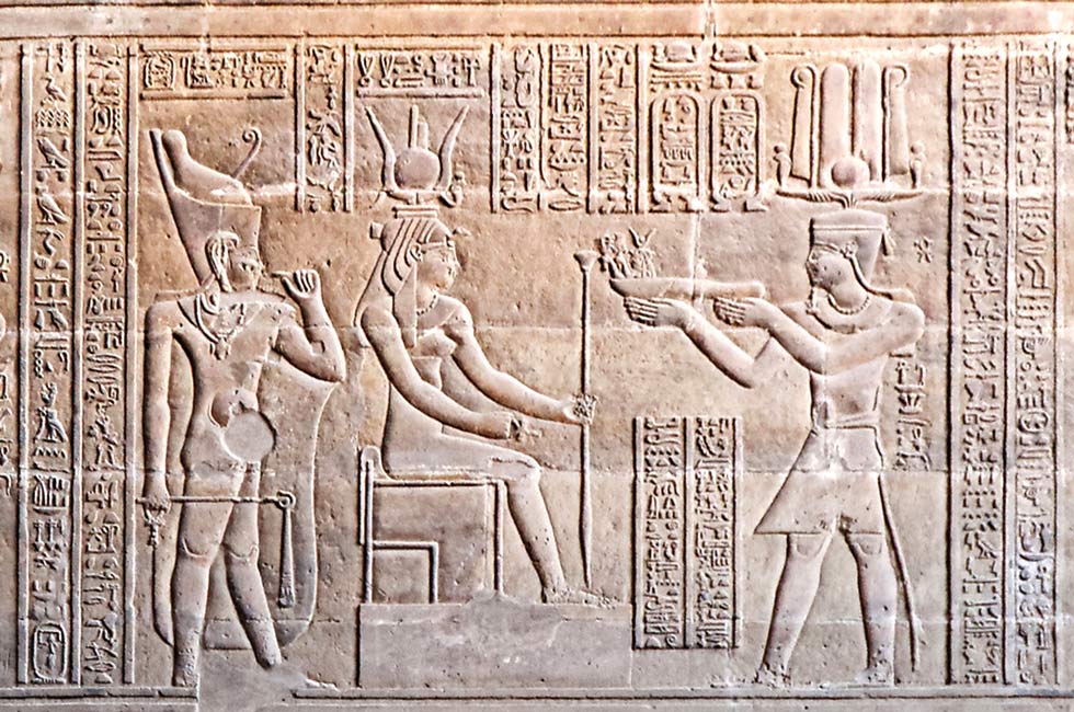 Caracalla fait l'offrande d'un bouquet d'éternité Heh à Khnoum d'Esna et à Menhyt.