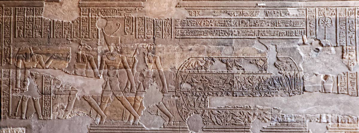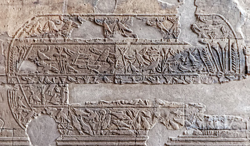 Encadré par Khnoum à l'avant et Haroéris, Commode tire vers Thot un filet rempli d'oiseaux et de poissons. A droite, Sechat regarde la scène.