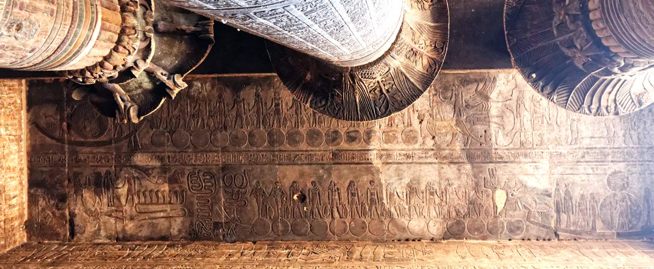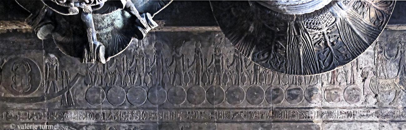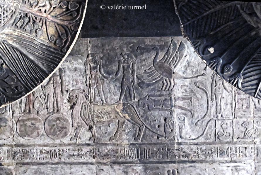 Le dieu Khnoum est dans un disque , un œil Oudjat dans un autre disque au dessus.