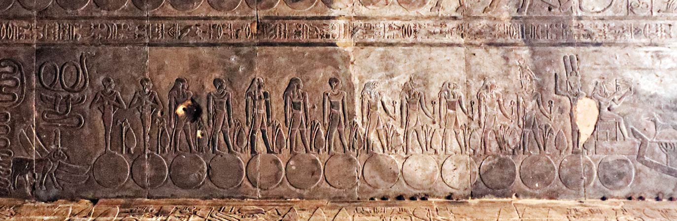 Se suivent un dieu à tête de faucon, Atoum, Chou, Tefnout, Geb, Nout, Osiris, Isis, Nephtys,