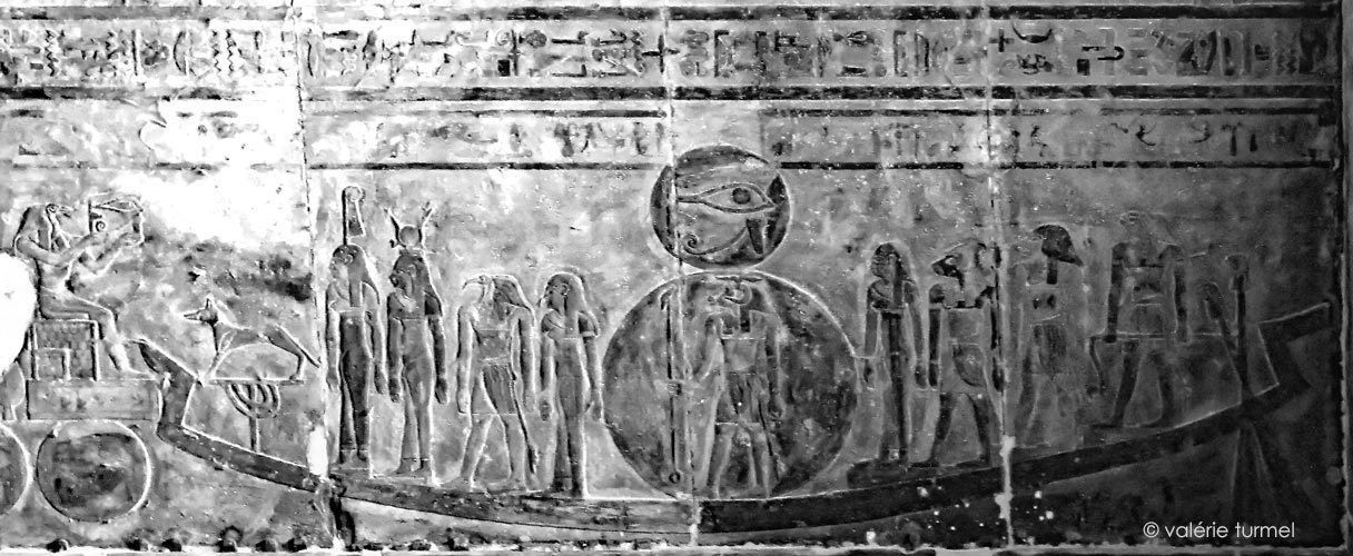 Devant la barque, Thot assis tend un œil Oudjat. A l'avant, un chien (Oupouaout?), puis Maât, Hathor, Thot, Isis.