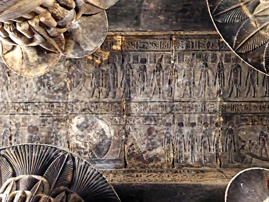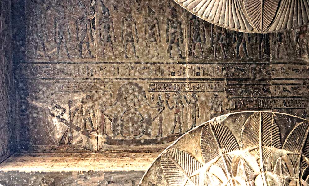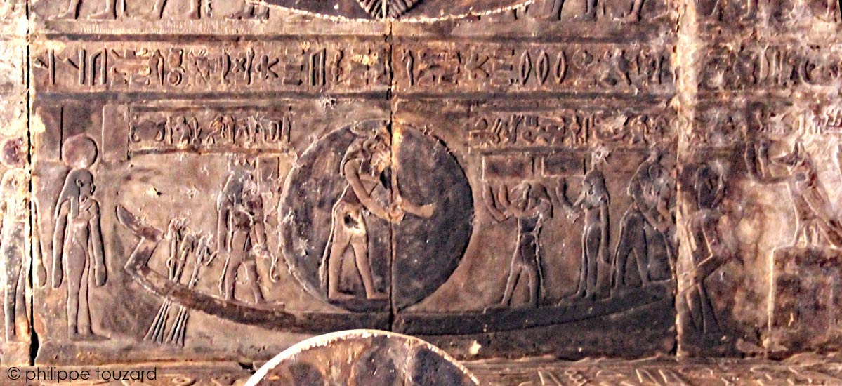 En bas, une barque portant un bélier à 4 têtes et Thot coiffé du disque de la lune adorant. Puis 6 personnages féminin debout dont le nom n'a pas été gravé et la barque du dieu.