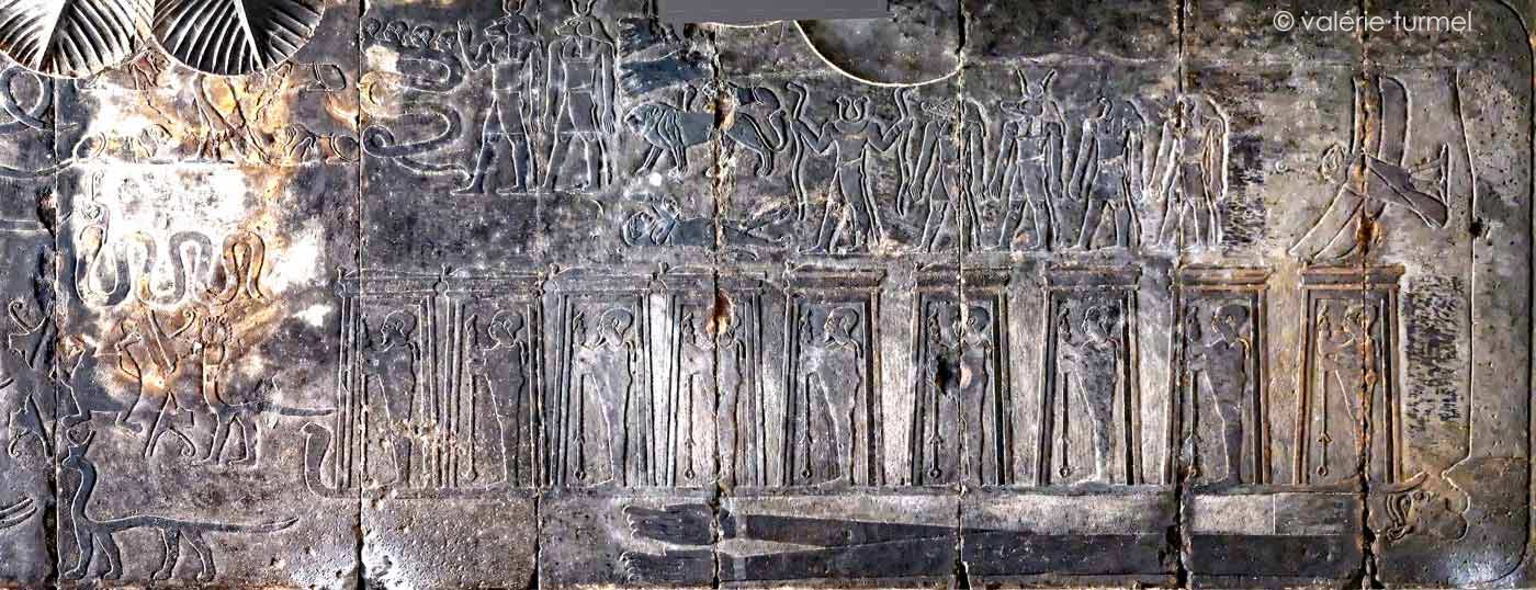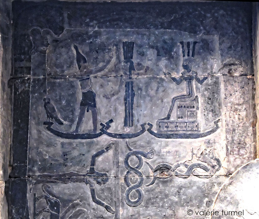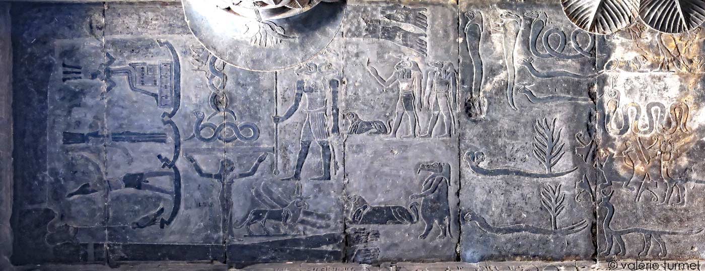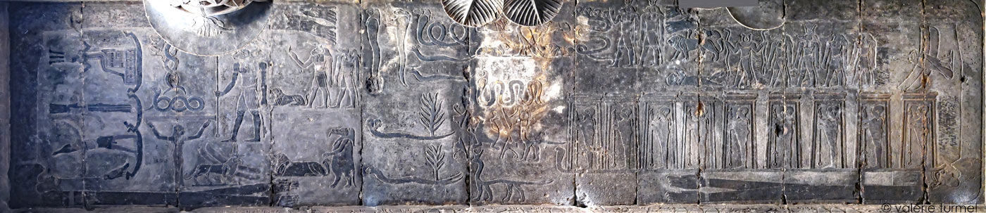 dieu Sobek. Ensuite, en haut, des serpents dressés ou non, avec des têtes différentes et en bas, deux serpents desquels s'élèvent des arbres.A gauche, le corps de la déesse Nout. (Sauneron n°451).