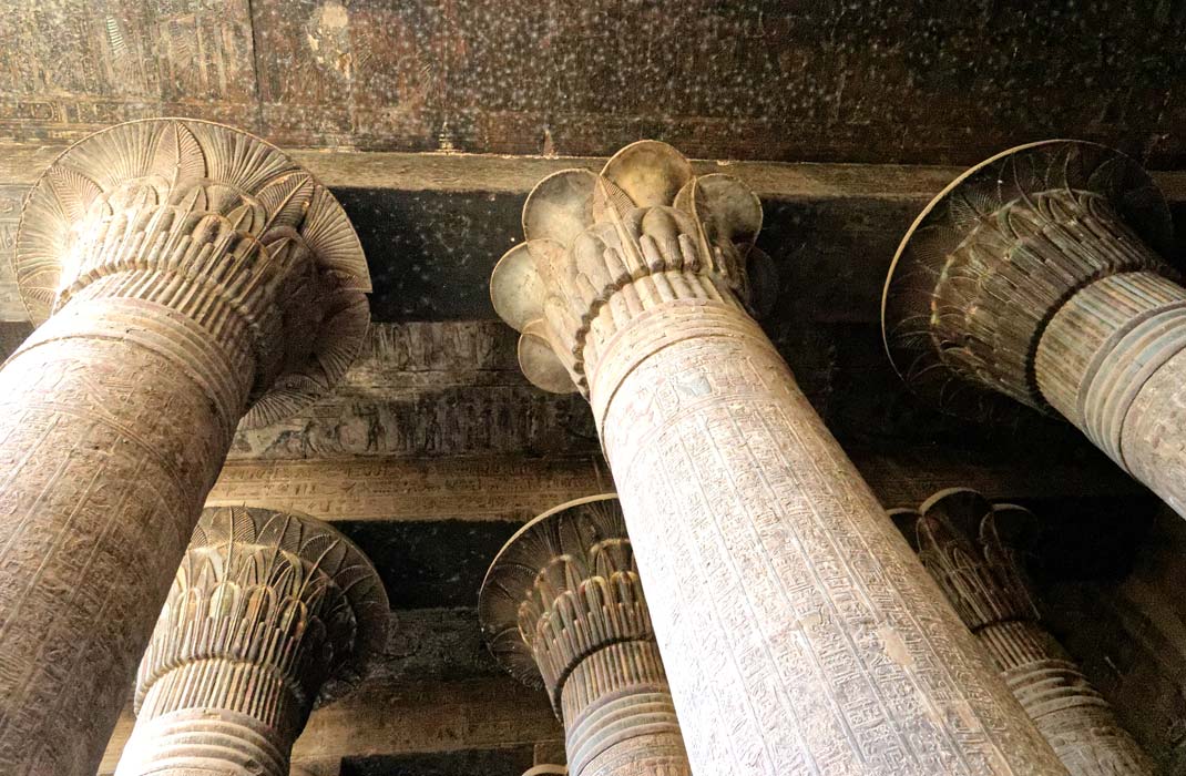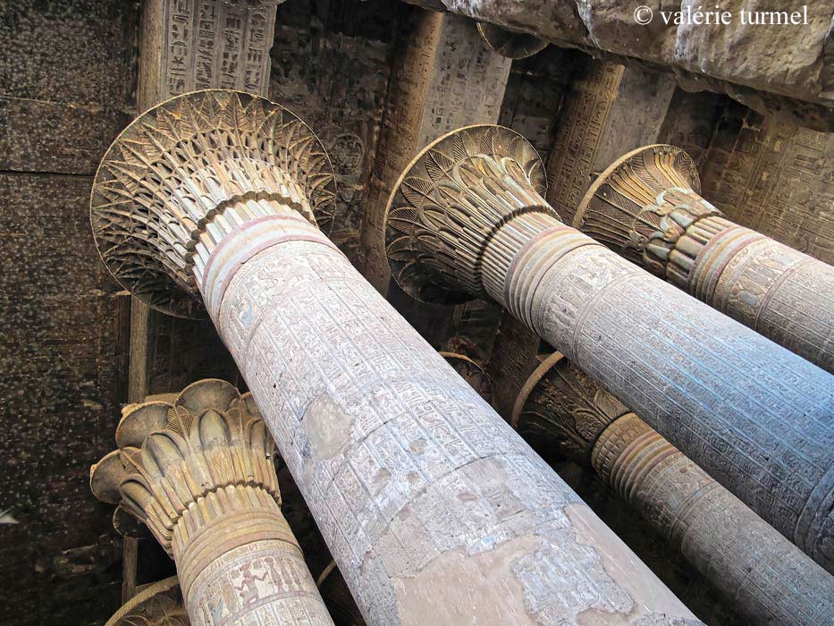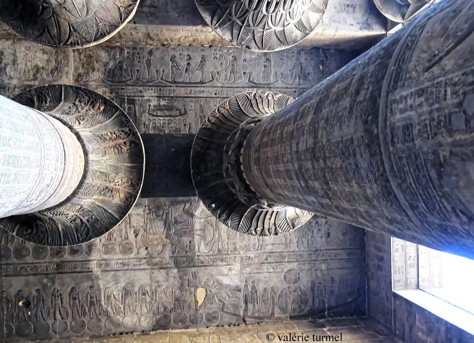 La travée centrale en haut et un aperçu des travées de la partie Sud du plafond composent cette vue.La partie centrale est décorée de vautours aux ailes déployées difficilement visibles à l'œil nu. Cette vue permet d'admirer la diversité des chapiteaux des colonnes.