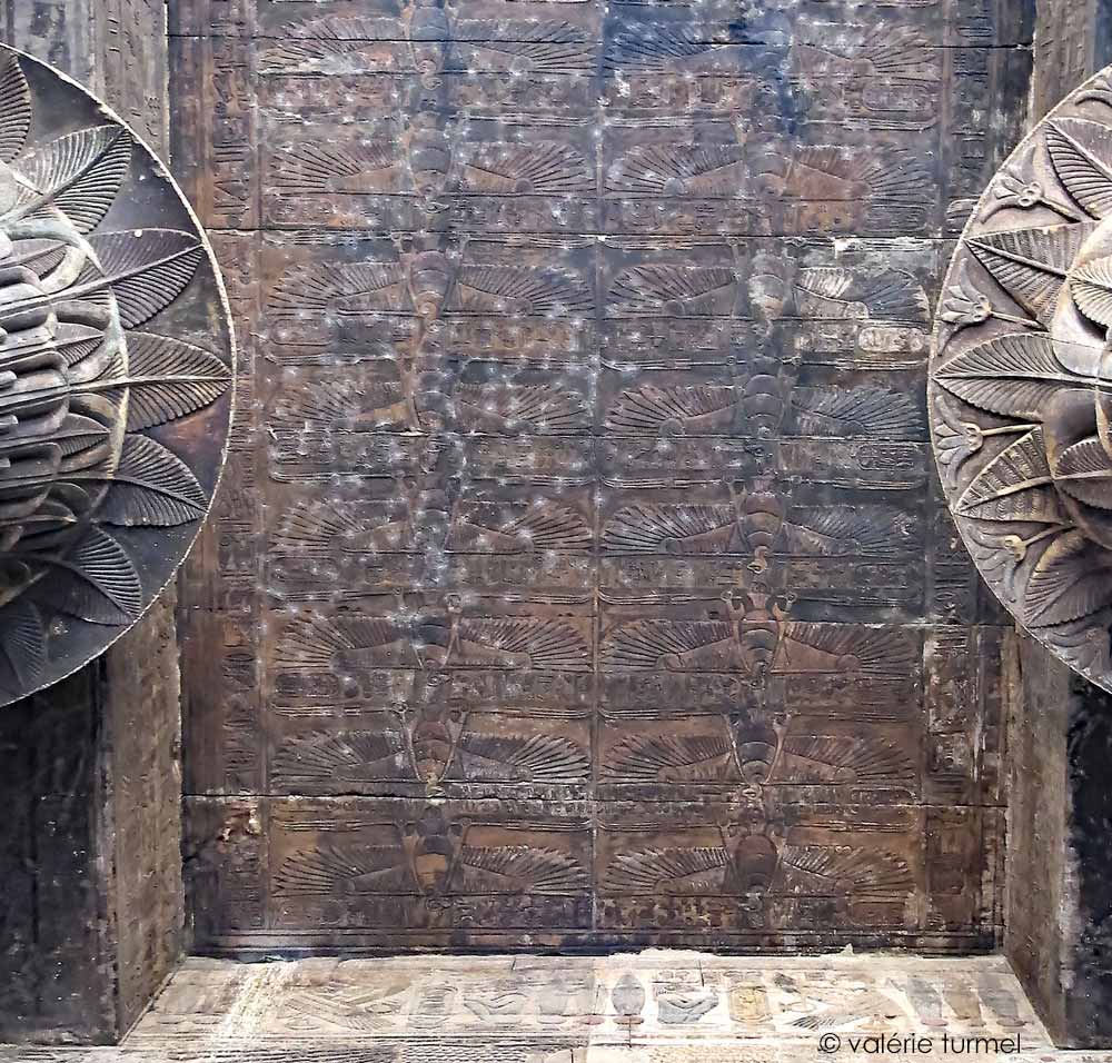 Sur la travée centrale, les vautors aux ailes déployées sont alternativement pourvus de têtes de vautours pour Nekhbet et de têtes de cobras pour Ouadjet. (Sauneron n°426).