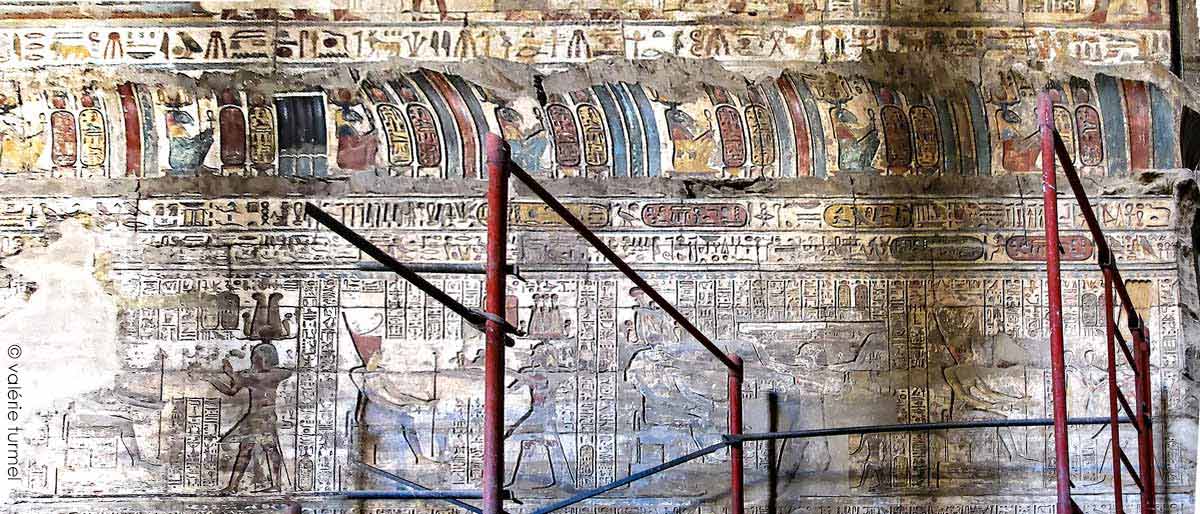 La partie nord était cachée en partie par des échafaudages lors de certaines visites. Les scènes du haut ont été reconstituées à partir de photos prises à deux époques différentes. Les dieux Khnoum de la frise portent alternativement des vêtements jaunes, bleus et rouges.