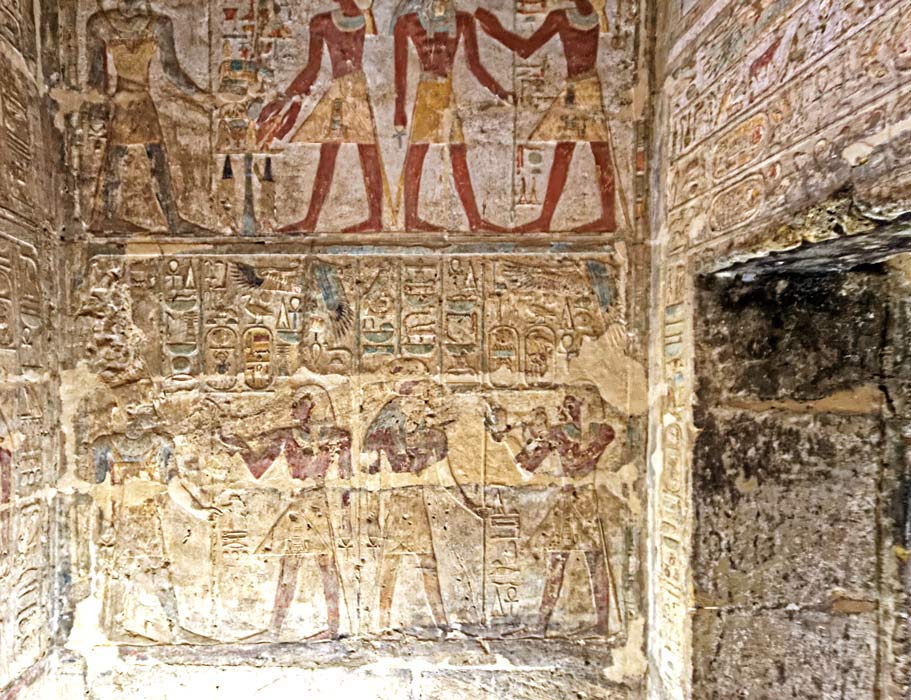 A droite sur la vue, la porte venant du sanctuaire. En face, la paroi Est avec 2 registres.
