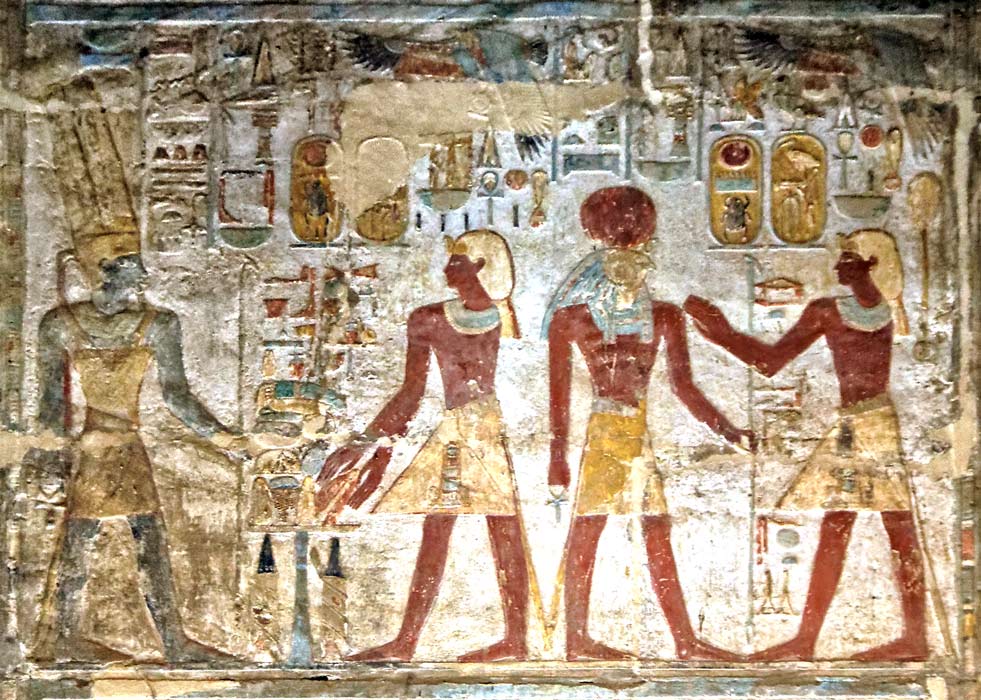 A gauche, le roi Aménophis II (Amenhotep) présente une cassolette d'encens allumé à Amon-Rê qui lui donne toute stabilité et puissance.