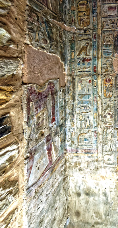 On voit une partie de la paroi Ouest avec un reste de scène. A gauche, la porte creusée dans le mur a été comblée en 1909 comme dans la chapelle A, mais ici la porte est restée bouchée; On le verra mieux dans la chapelle D.