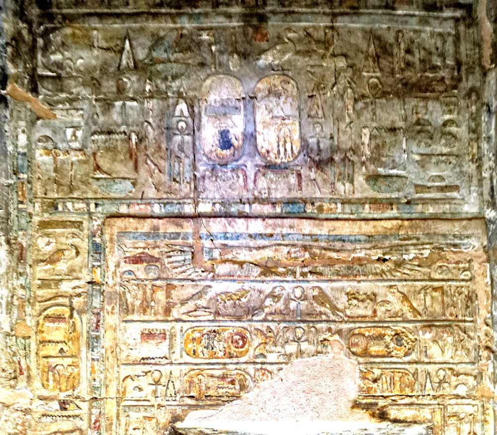 Les 2 colonnes de texte du montant de gauche portent les cartouches d'Aménophis II.