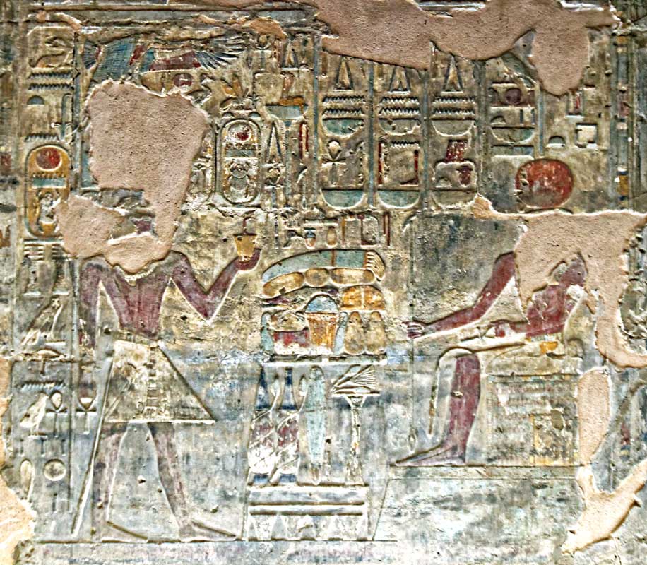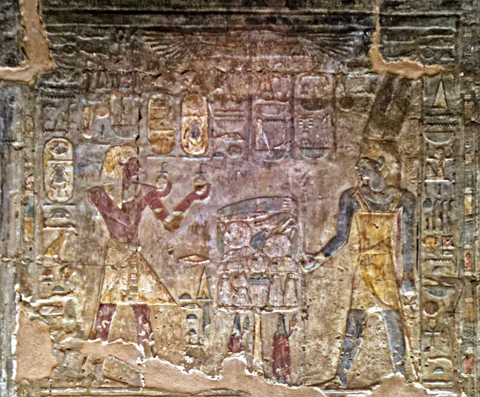 Le roi Thoutmosis III présente 2 vases de lait à Amon-Rê dont la chair est bleue. Le dieu Amon-Rê est debout : il donne au roi toute santé, toute joie, toute satbilité et puissance. Au dessus, Behedety veille.