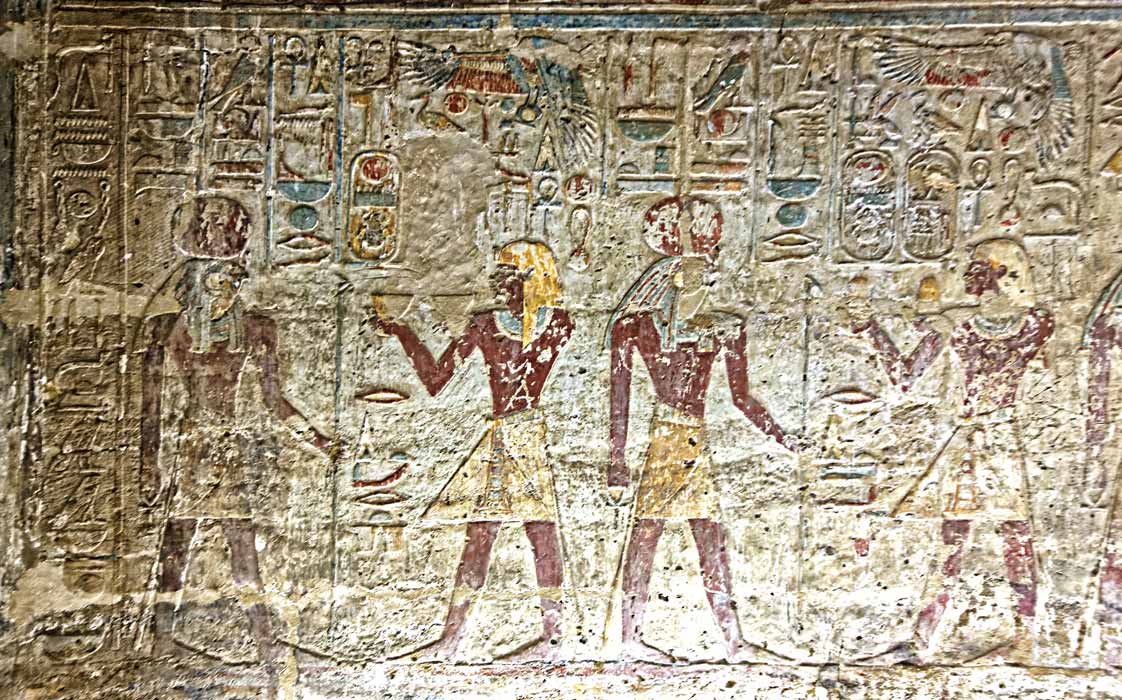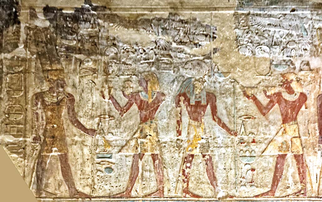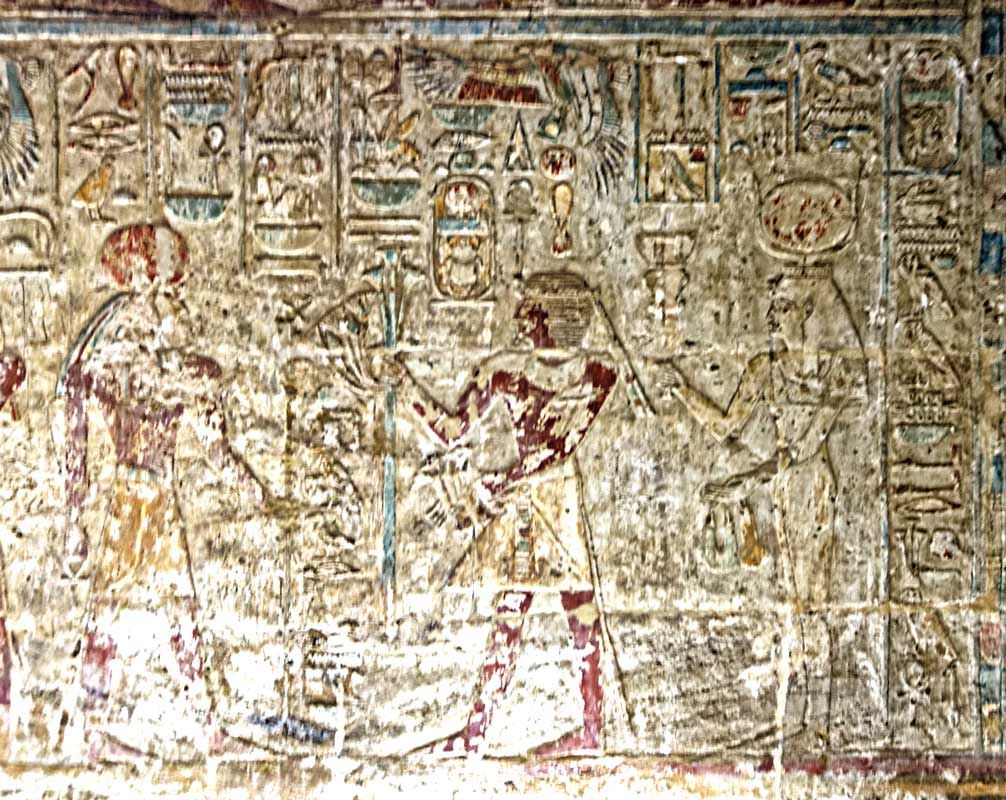 Le roi Thoutmosis III offre 2 vases jaunes au dieu Rê-Horakhty qui lui donne tout pouvoir et toute joie. Au dessus, Nekhbet.