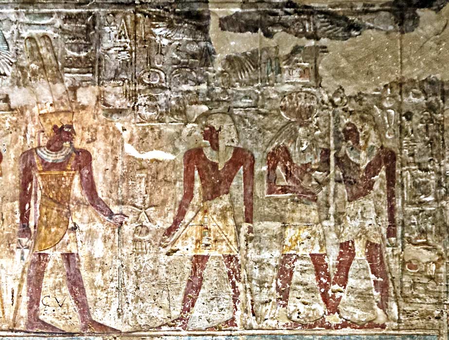 Registre du haut : le roi Thoutmosis III adore Amon-Rê 4 fois. Ouadjet veille. le dieu Amon donne au roi toute vie, stabilité, pouvoir et santé.
