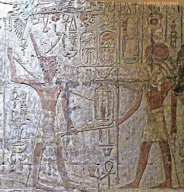 Le roi Thoutmosis III et la déesse Sefekhet-Abouy (autre nom de Sechat) tendent le cordeau sur les pieux pour délimiter l'enceinte du temple. Le roi est représenté en sens inverse des autres scènes., probablement à la place d'un autre personnage. Behedety plane. La déesse donne toute vie et pouvoir.