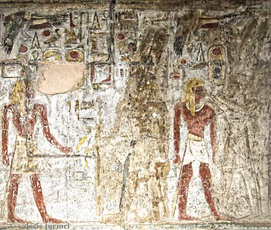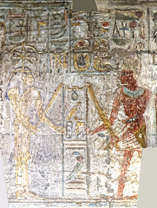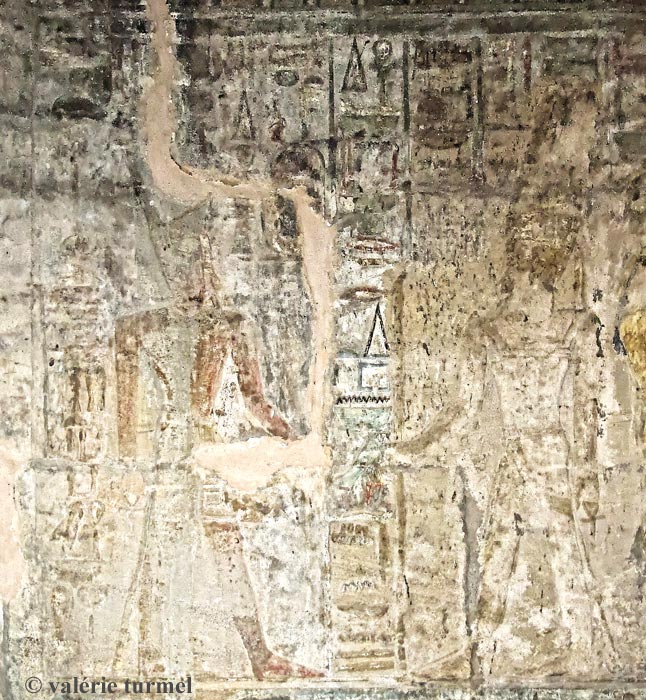 Registre du haut : le roi Thoutmosis III se tient debout devant Amon-Rê. Nekhbet veille sur le roi. Le dieu lui donne toute vie, stabilité, pouvoir et toute santé.