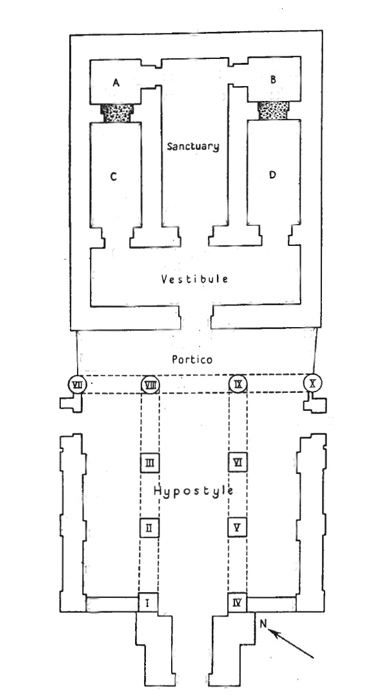 Thoutmosis IV y fit construire une salle hypostyle de 12 piliers précédant un portique avec 4 colonnes. 6 piliers furent ensuite intégrés dans des murs fermant la salle hypostyle.