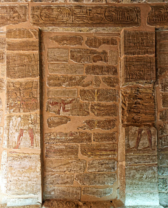 Dans la grande scène, sur le pilier de droite, Thot écrit sur l'arbre Ished les noms du roi. Le roi est agenouillé devant le dieu Atoum assis. La scène a été mutilée à une époque indéterminée, mais postérieure à la visite de Gauthier qui décrit très bien le dieu Thot sur la pilier de droite.