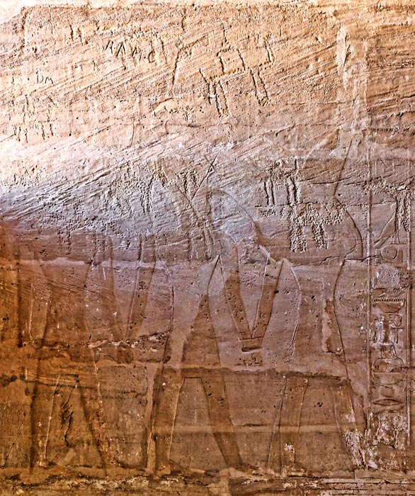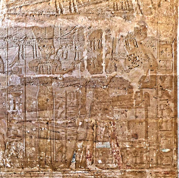 Il s'agit de la scène de gauche de la façade du temple primitif. Le roi Thoutmosis III est conduit par 2 dieux dans une scène dite de Montée Royale.