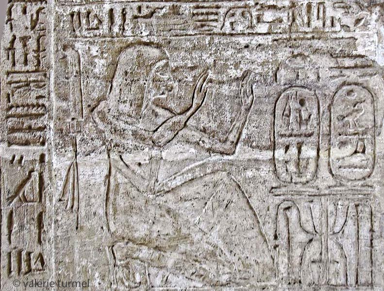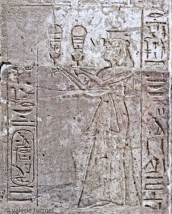 La reine Taousert agite deux sistres. Épouse de Sethy II, elle régna 2 ans après les décès de Siptah, successeur de Sethy II. La présence du cartouche indique que la scène fut gravée sans doute pendant son court règne, au moment de restaurations qu'elle fit effectuer dans le temple.