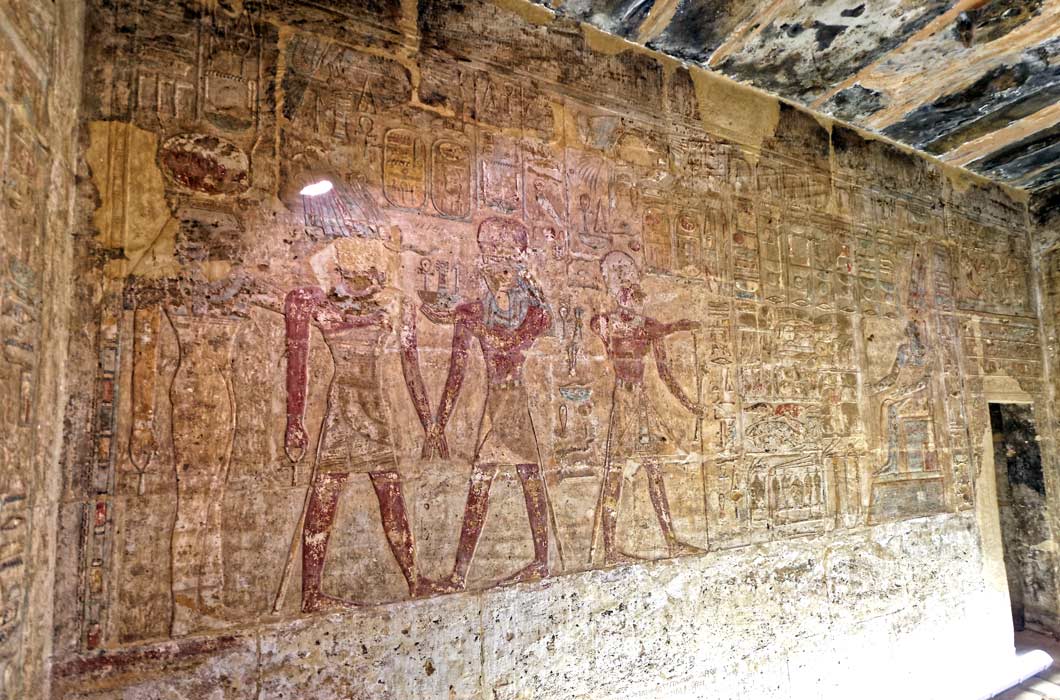 La scène de gauche montre le roi entre Hathor et Rê. Dans la scène de droite, le roi offre des offrandes au dieu Amon