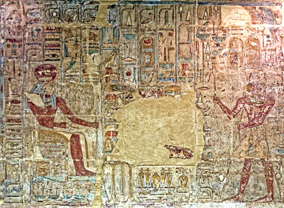 Le roi Thoutmosis II présente un monceau de victuailles à Rê-Horakhty. En retour le dieu lui donne les années d'éternité,