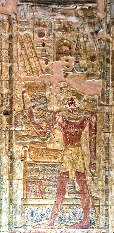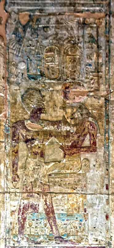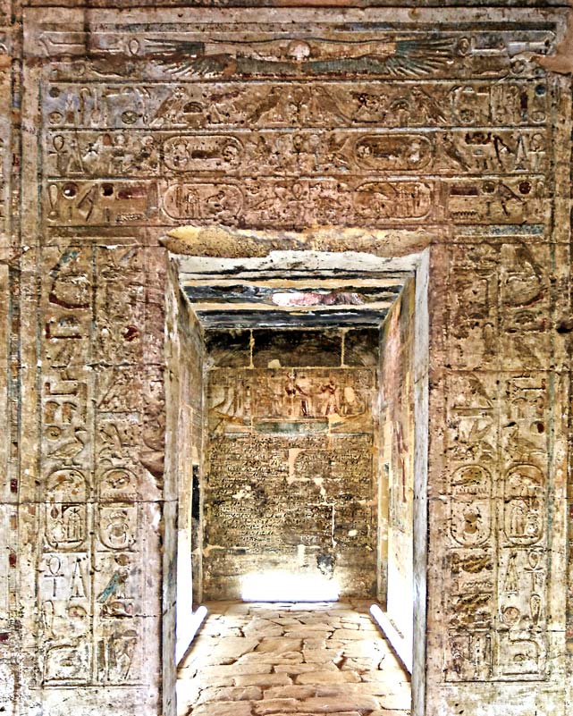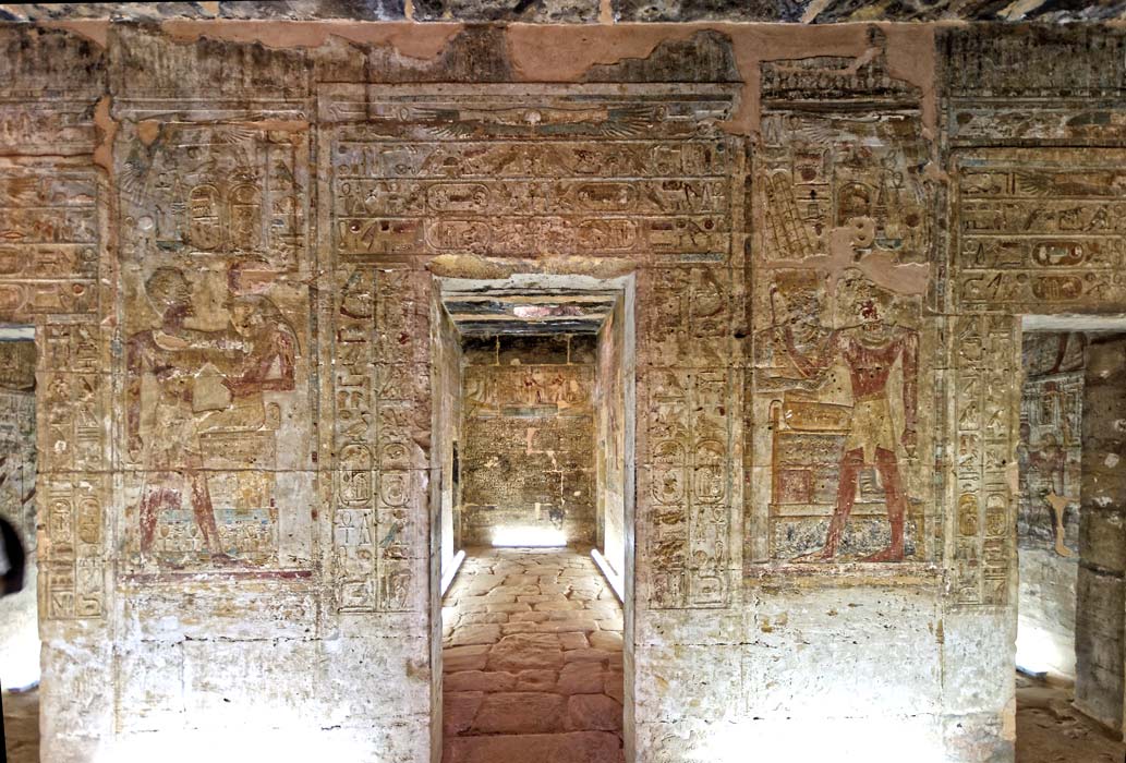 La porte extérieure du sanctuaire est surmonté par Behedet qui donne la vie. En dessous, le linteau comporte des inscriptions symétriques avec la titulature de Thoutmosis III qui est dit 'aimé de Rê-Horakhty' et 'aimé d'Amon-Rê'. On retrouve les 2 expressions sur les montants. Au fond, la paroi Est du sanctuaire avec la barque.