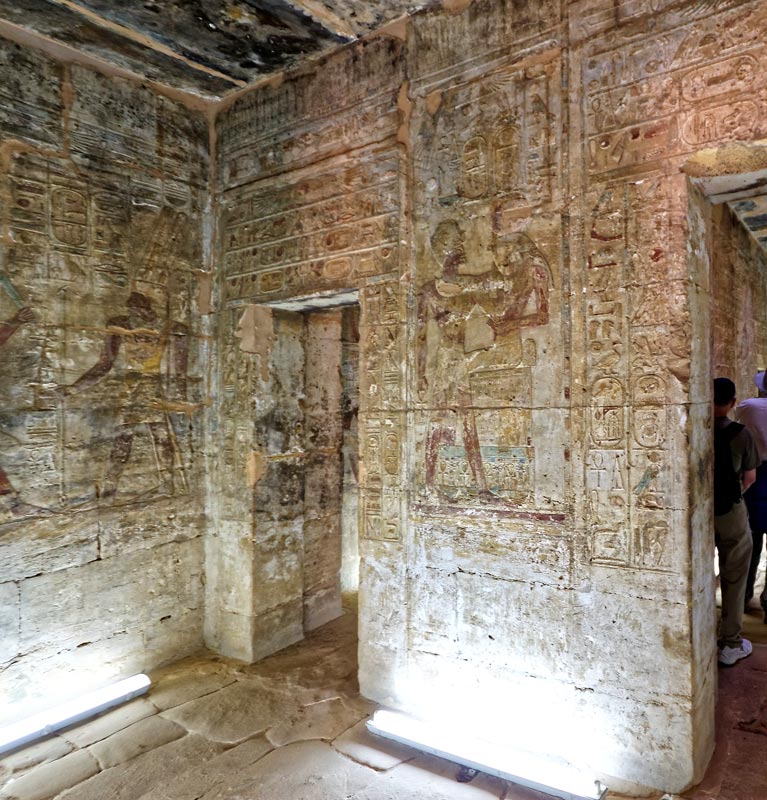 En continuant dans le même sens, on trouve la partie suivante qui montre l'entrée de la salle dite C à gauche et une partie de la porte du sanctuaire à droite. Entre les deux, une scène avec Aménophis II (voir plus loin).