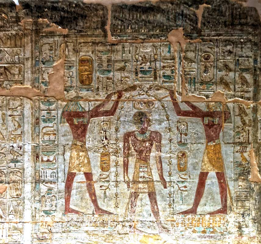 Le roi Aménophis II est purifié par l'eau sacrée coulant sous forme de signe Ankh. A droite, le dieu Horus dEdfou et à gauche le dieu Thot lui verse l'eau purificatrice. les dieux sont montés sur de petits socles décorés de signes Ankh, Djed et ouas. Ils récitent tous les eux la même formule inscrite devant eux avec le nom du roi à droite devant Horus et le nom de Fils de Rê à gauche devant Thot.