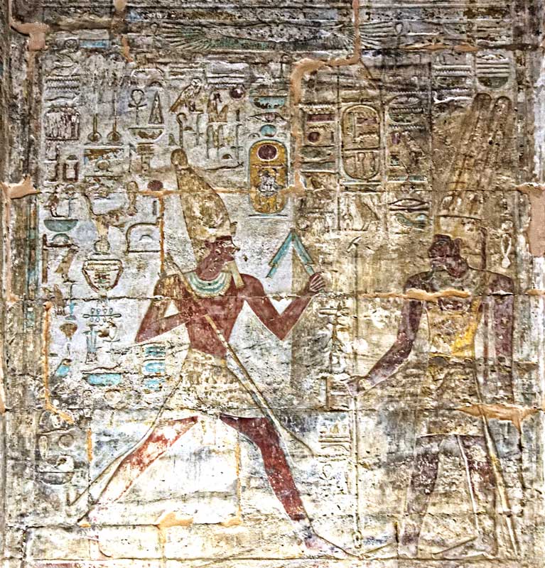 Le roi Aménophis II effectue une course rituelle. dans sa main droite, il tient la rame et dans sa main gauche le gouvernail. Il court devant le dieu Amon., son pied droi reposant sur ses orteils. Au dessus de la scène, veille Behedet, qui donne la vie. le dieu Amon-Rê donne toute victoire au roi.