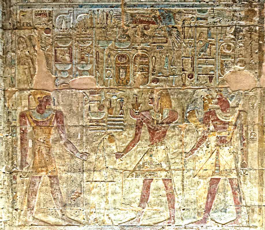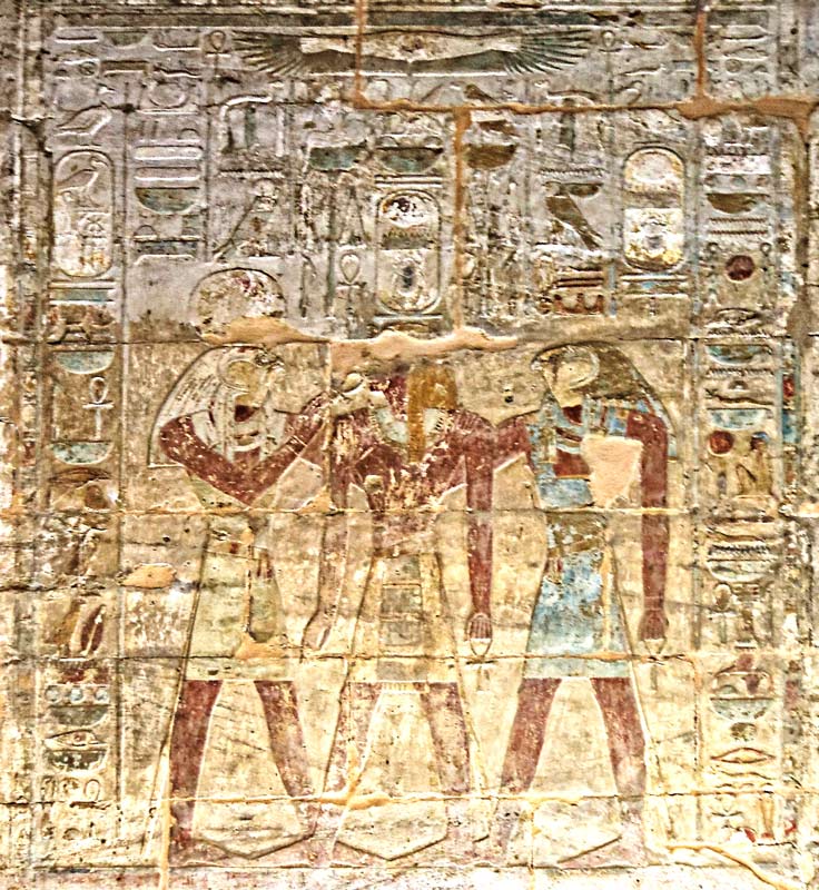 A droite, Thoutmosis III est embrassé par Isis : les deux visages sont bouche à bouche. La déesse passe son bras gauche derrière la tête du roi et sa main droite tient la poitrine du roi. Isis donne la vie, la santé et la puissance.