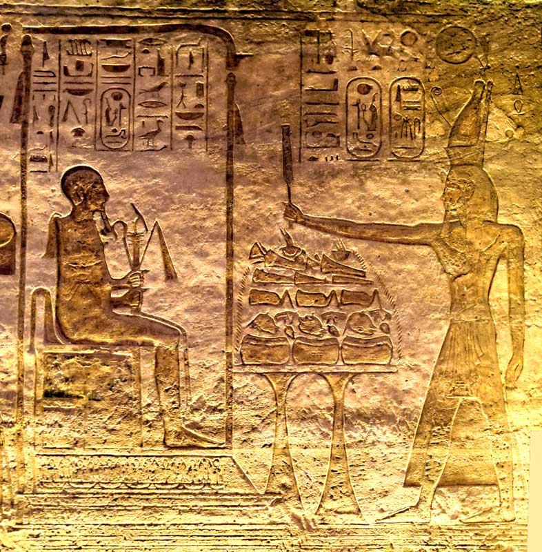 Paroi Nord côte Est : le roi consacre des offrandes devant Ptah. Sont posés sur deux guéridons des cuisses de boeufs, des têtes de veaux, différents pains...Ptah est assis dans une chapelle, siégeant sur son trône. Il tient différent sceptres dont le heka et le flagellum qu'il va remettre à Ramsès comme il le dit dans ses paroles.