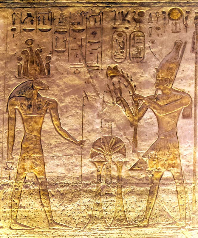 Scène suivante : le roi offre 2 bouquets de papyrus et 3 vases au dieu Herychef, ayant un corps d'homme et une tête de bélier portant la couronne Atef. Originaire d'Herakleopolis, son nom se traduit par : 'Celui qui est sur son lac'. Son caractère royal se traduit dans ses dénominations, comme ici, par "Roi des Deux-Terres, souverain des Deux Rives". Dans cette scène, il donne au roi toute vie, tout pouvoir, toute santé et toute joie.