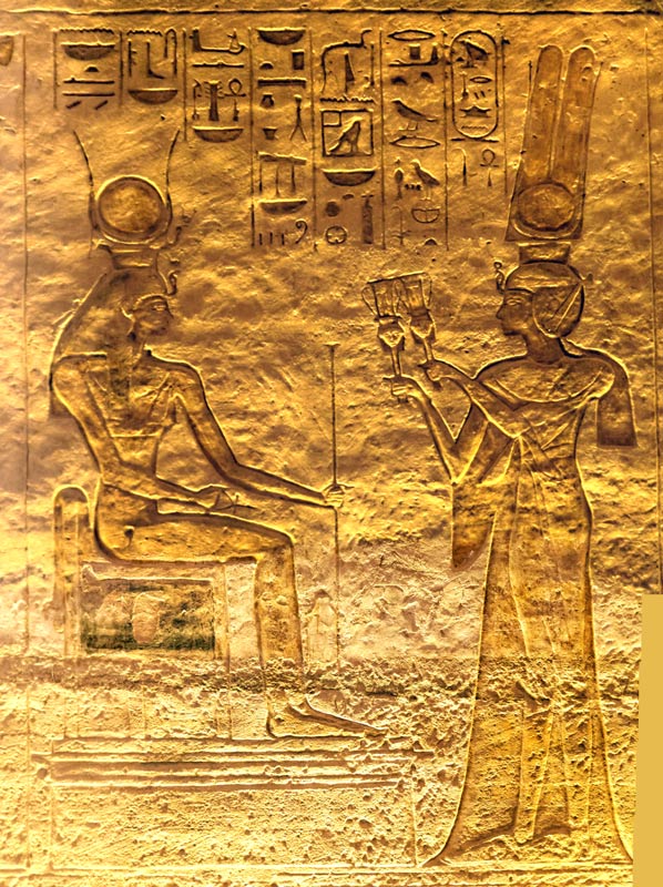 Scène suivante : la reine Nefertari agite deux sistres-naos pour réjouir le coeur d'Hathor. Satisfaite, la déesse lui donne toute vie, toute stabilité, tout pouvoir et toute santé. Cette scène fait pendant à celle de la paroi Sud au cours de laquelle Nefertary fait des offrandes à Anouket.