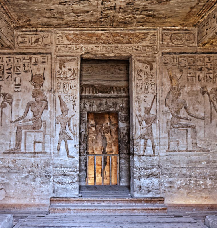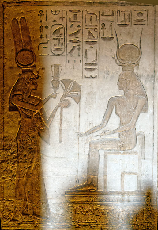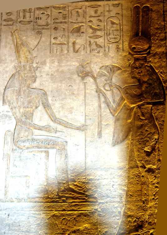 Paroi Ouest côte Sud : la reine Nefertari offre des lotus et agite le sistre-naos devant Hathor, maîtresse d'Ibchek. Le bruit du sistre apaise la déesse qui donne à la reine toute vie et tout pouvoir, toute santé.